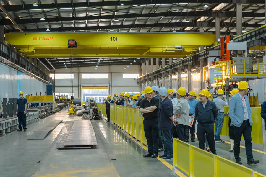 10月18日下午,所有参会代表一并参观大满贯扬州智能工厂。大满贯扬州智能工厂学习了欧洲先进制造经验,在此基础之上,研制了欧式起重机主梁专用工艺、腹板整切工艺、整梁抛丸消应力工艺、预组装工艺,以及主梁智能制造生产线,比如加强筋自动组焊线、隔板机器人、主梁组立机器人、智能平台等,使整体生产效率提升约300%,节省人工近60%。