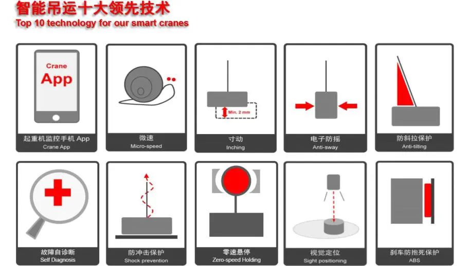 大满贯智能AI技术,包括自动定位、故障自诊断、防冲击保护、防斜拉保护、防抱死保护、电子防摇、自动纠偏、自动对中、区域保护、寸动、微速、【掌上起重】手机APP、远程监控、HMI等,让起重机更安全、更智能。